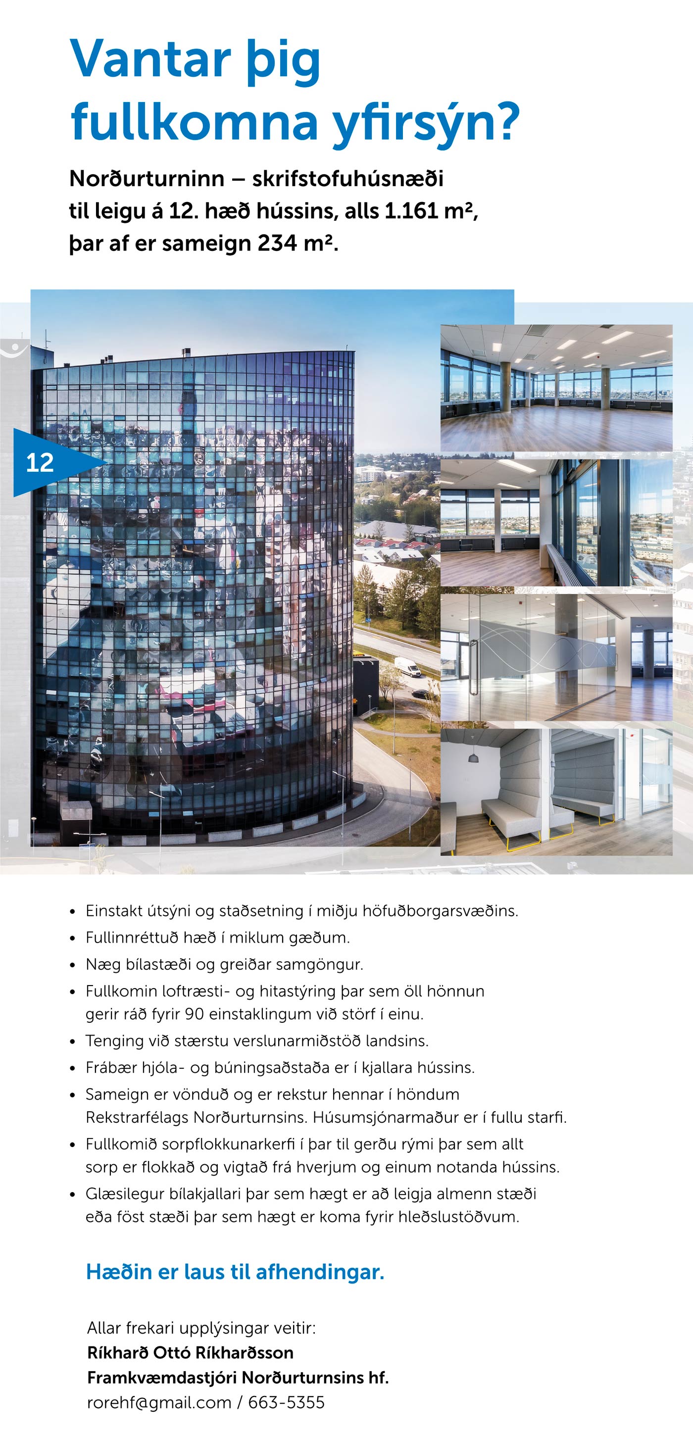 Norðurturninn – skrifstofuhúsnæði til leigu á 12. hæð hússins, alls 1.161 m2, þar af er sameign 234 m2.